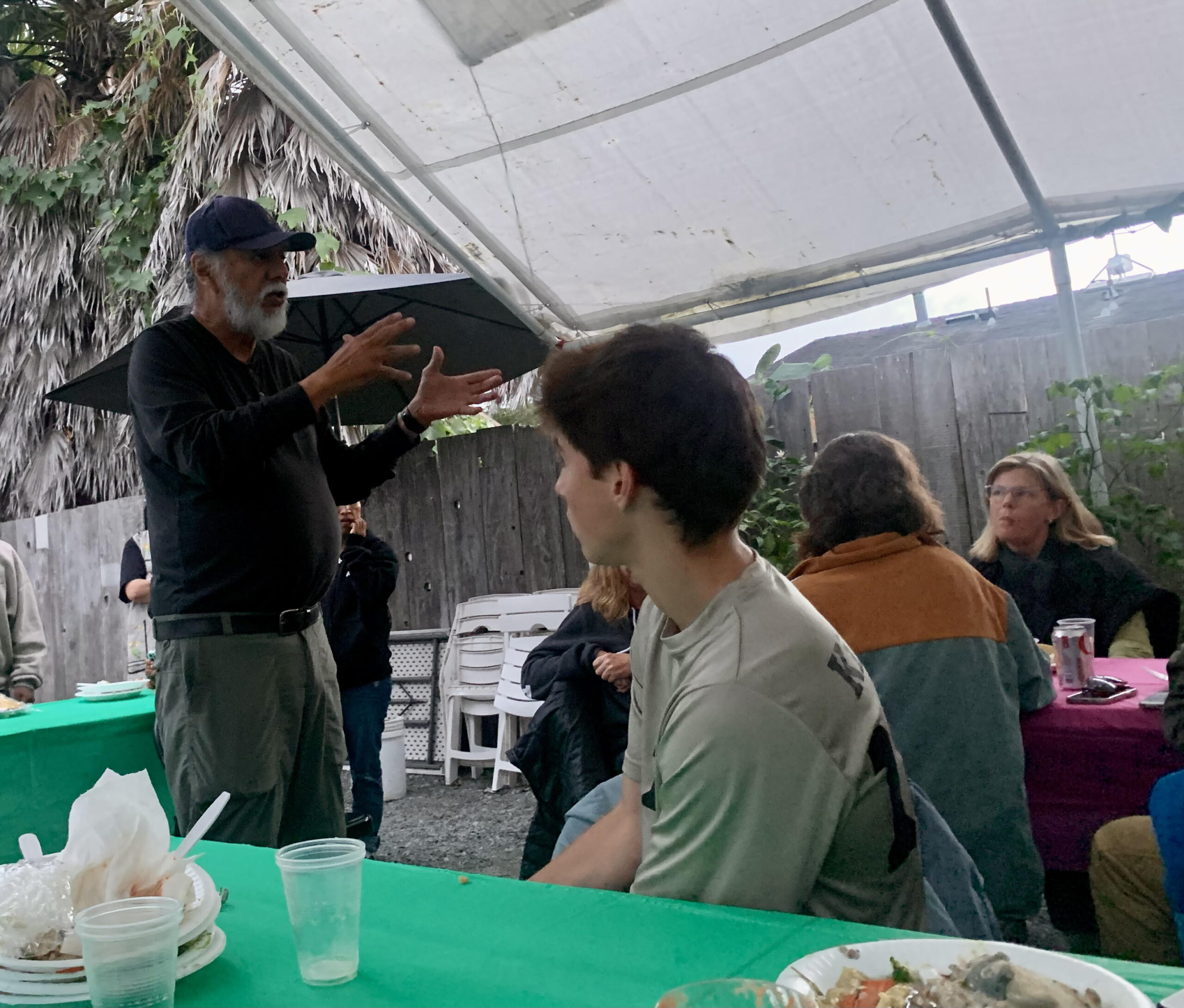 The caravan ends up at the home of Ernestina, a fieldworker, community organizer, mother and grandmother in downtown Watsonville. As we walk down the sidewalk, we laugh at a goat with corks on its horns that is frolicking on a trampoline, along with two small children, in the front yard adjacent. Along the side of Ernestina’s house leading to the back, a line of potatoes is popping up through the dark earth. There are tomatoes and other vegetables along the fence and a citrus sapling drips with round green orbs in a small pot. An enormous ancient maple tree leans over a canopy which covers several open tables with colorful plastic tablecloths. They are soon filled with plates of beans, rice, and fish that emerge from Ernestina’s kitchen. She comes out wearing an apron, her hair tied up in a handkerchief. Her little grandson has been roaming around and she sits him down with a fork. She  places a piece of strawberry cake in front of him decorated with pink frosting roses.