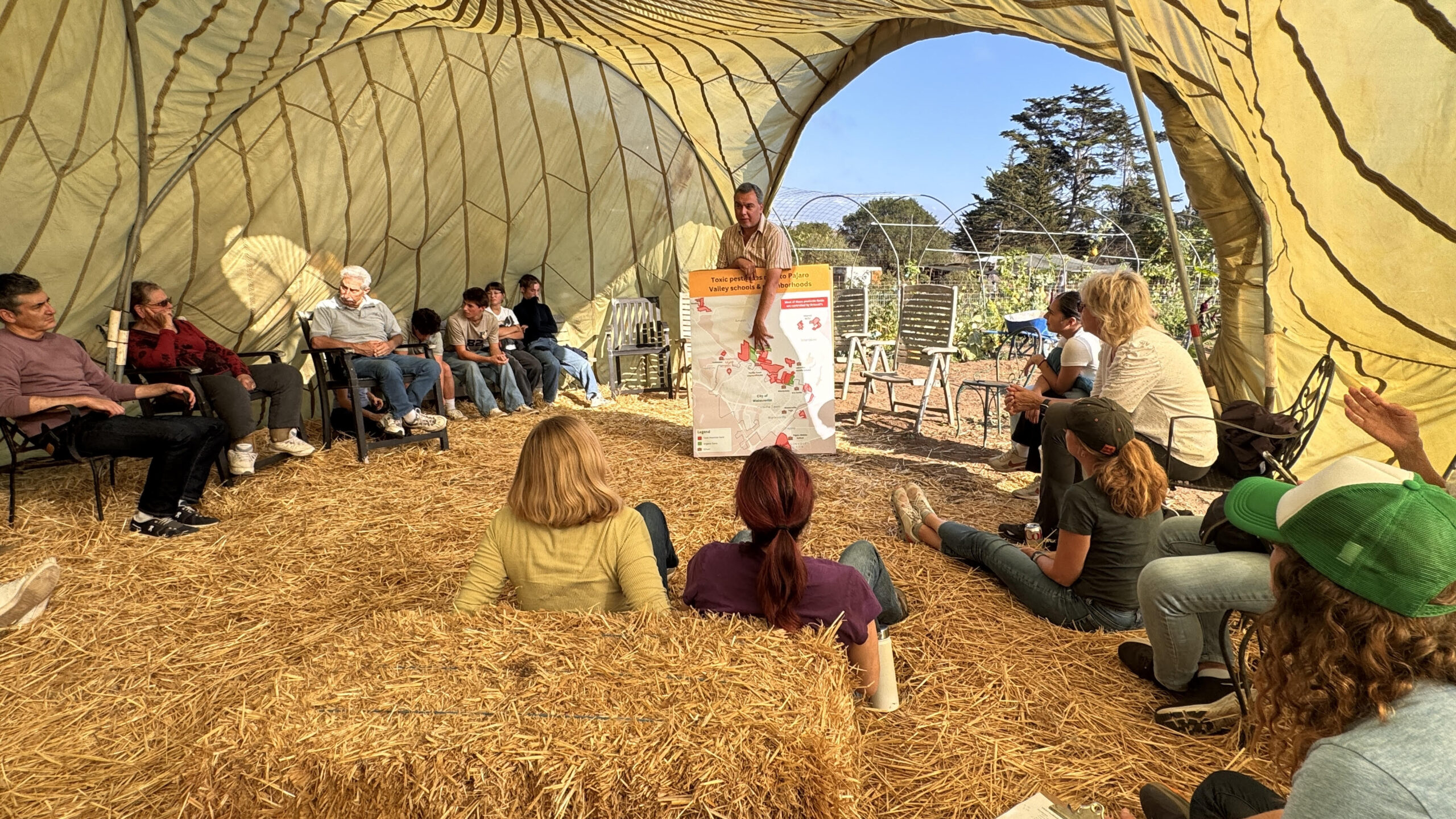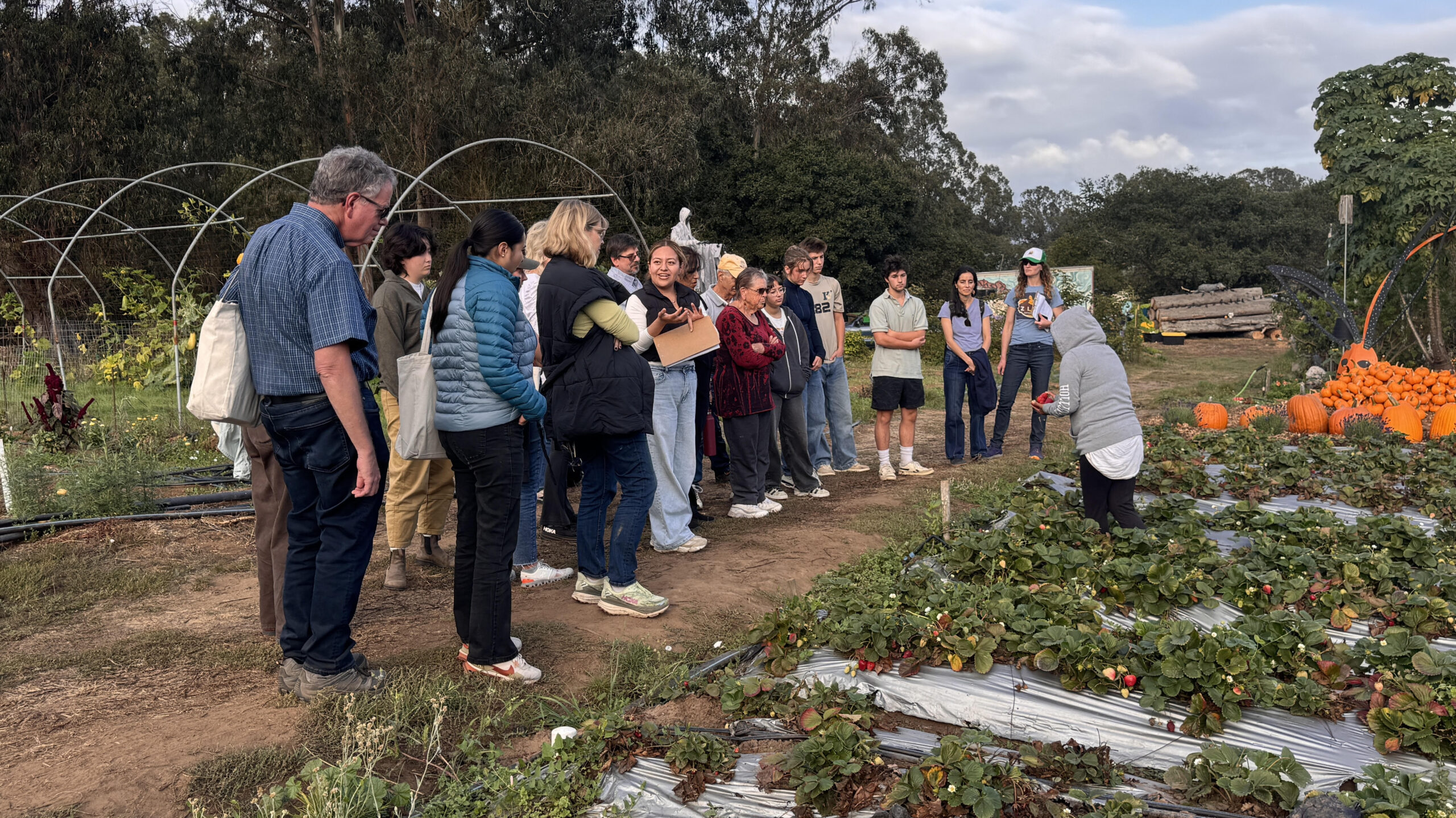 Two cupped hands full of strawberries travel through a group of adults and students on an organic farm near the coast. The morning fog has dissipated. The sun shines down on arbors of squash, tufts of corn, and rows of green bushy plants. By the late afternoon in Santa Cruz County, the heat will beat down on thousands of people working in the fields. This area in and around the town of Watsonville is deemed the strawberry capital of the world. According to a recent county report, agriculture contributed more than $1.5 billion to the local economy in 2023 and supported nearly 12,000 jobs, directly and indirectly. This means that one in 18 jobs in the area is supported by agriculture.